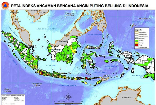 Berdasarkan data Badan Nasional Penanggulangan Bencana (BNPB), beberapa daerah di Indonesia yang rawan mengalami angin puting beliung, antara lain: