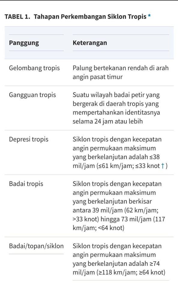 iklon tropis adalah sistem cuaca bertekanan rendah yang berkembang di perairan hangat lautan, biasanya antara garis lintang 30° LU dan 30° LS ( 1 , 2 , 5 , 6 ). Sistem siklon berputar berlawanan arah jarum jam di belahan bumi utara dan searah jarum jam di belahan bumi selatan. Sistem tropis berkembang melalui siklus hidup yang mencakup tahapan gelombang tropis, gangguan tropis, depresi tropis, dan badai tropis ( tabel 1 ). Tergantung pada lokasi geografisnya, siklon tropis dengan kecepatan angin melebihi 74 mil/jam (118 km/jam) disebut “badai” di Atlantik Utara, Karibia, Teluk Meksiko, Pasifik Utara bagian timur, dan pantai barat Meksiko. ; “topan” di Pasifik barat; dan “siklon” di Samudera Hindia dan Australasia ( 1 ), (Oxford Academic, 2005)